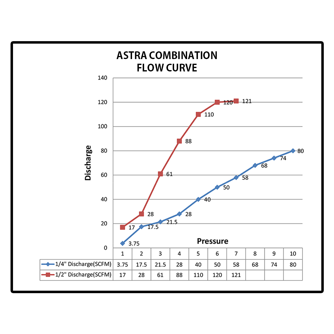 The Astra Series may look expensive--- but it isn't. Designing the basic Filter, Regulator and Lubricator Module for all pipe sizes allow standardization on component parts. Therefore, cost is comparable in conventional 1/4", 3/8", and 1/2" size models.