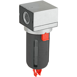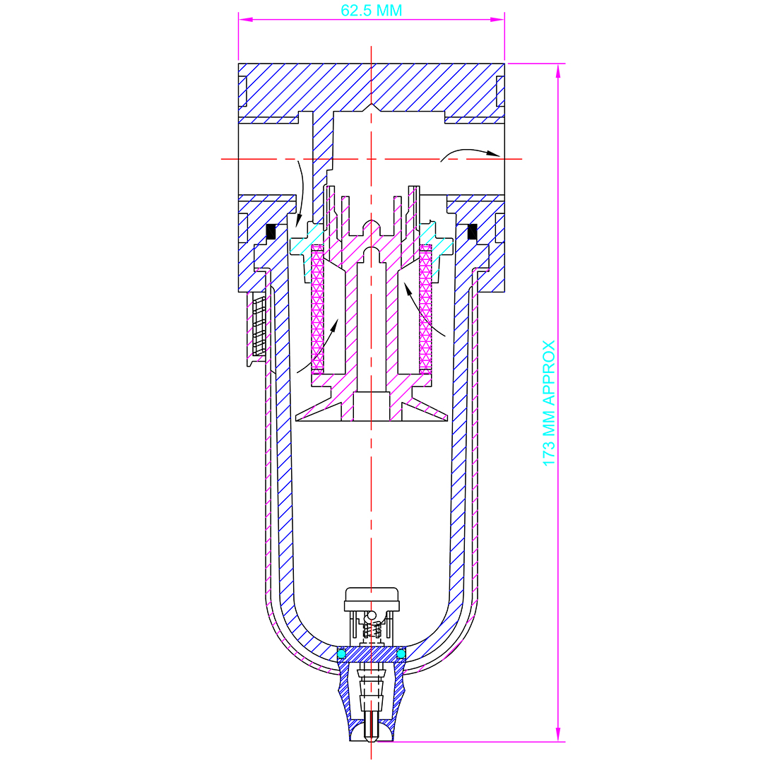 With two stage cleaning action this filter protects the up-stream equipments from major dirt, rust, pipe scale, and centrifugally cleans and keeps the contaminated moisture, oil carry over, liquids and condensate at bay. The collected contamination can be drained from the feather touch manual drain at the bottom by pressing the drain lever flaps.