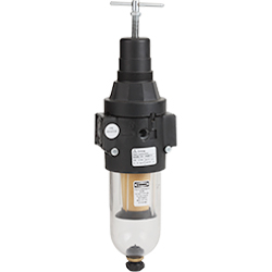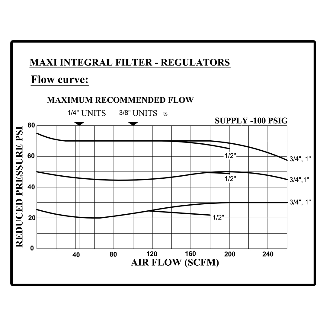 The maxi Integral Filter-Regulator Combines the Maxi Filter and Regulator into one space-saving package. Since it has the same features and performance as the individual filter and regulator, it is ideal for use when over-all height is not a problem. The integral is less expensive and easier to install (only two connections). Also, it can be used in conjunction with lubricator to make a compact, economical Filter Regulator and Lubricator combination unit. The removable, interchangeable pipe port insert feature of the Maxi series, fits any pipe size from ¼” to 1” by just changing the inserts.
