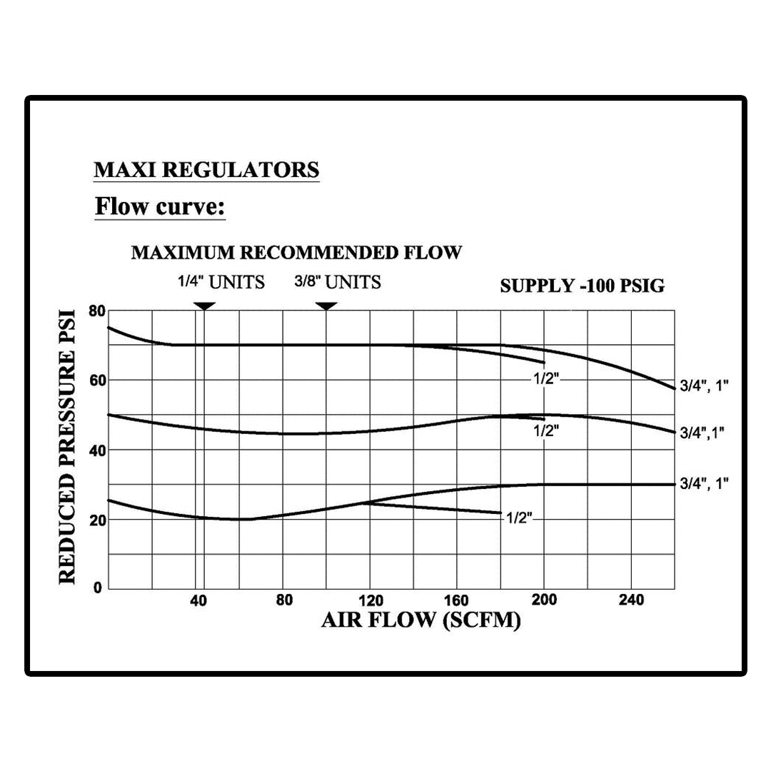 The Maxi Regulator accurately and precisely controls air line pressure at any set level from 250 PSI down to zero and any flow rate upto 250 SCFM. Variation in either supply pressure or air flow rate has no significant effect on regulated pressure.